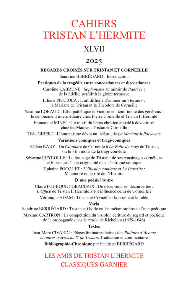 Cahiers Tristan L’Hermite, XLVII – 2025 : Regards croisés sur Tristan et Corneille, Classiques Garnier, 2025.